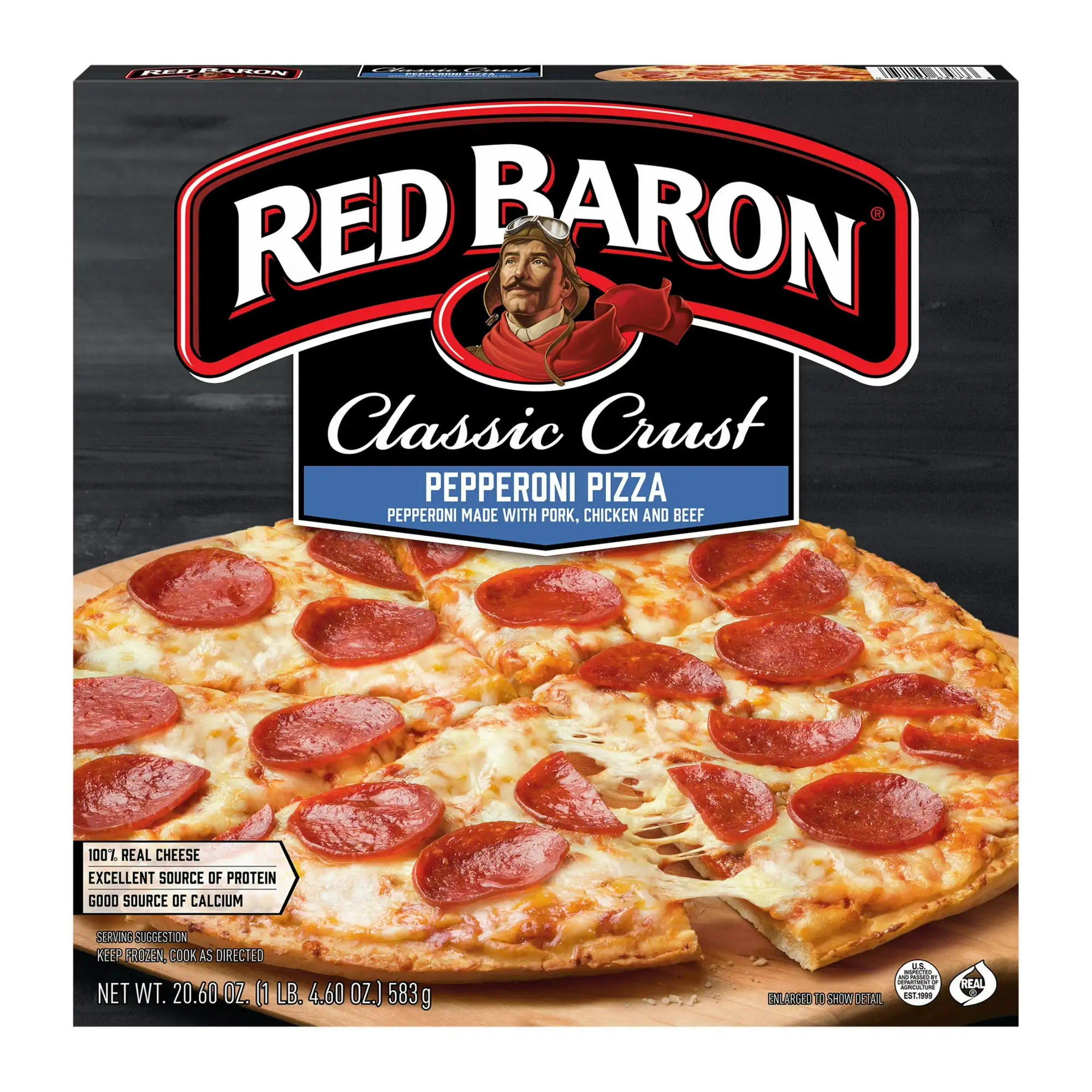 RED BARON CLASSIC CRUST PEPPERONI PIZZA is made with zesty tomato sauce, 100% real cheese, and a hearty topping of pepperoni